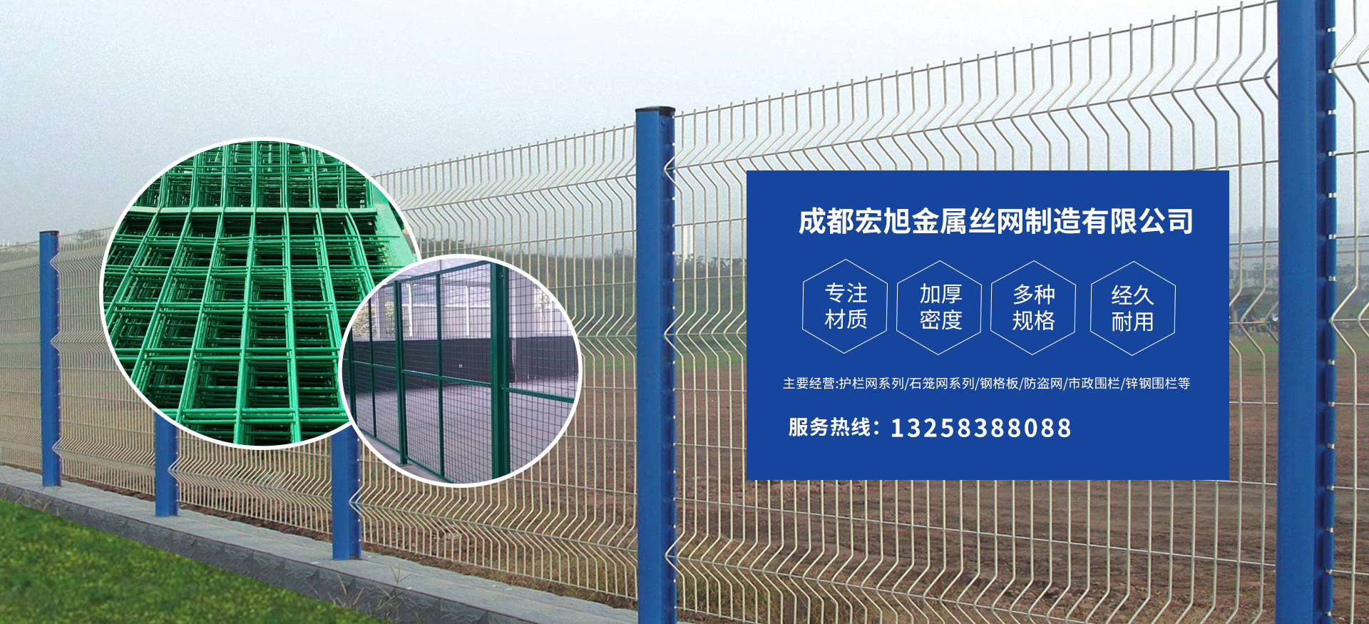 成都宏旭金屬絲網制造有限公司主營護欄網系列、石籠網系列、鋼格板、防盜網、市政圍欄、鋅鋼圍欄、鋼筋網片、聲屏障系列、波形護欄板、柔性纜索護欄、SNS邊坡防護網等其他絲網類產品。特殊規(guī)格可加工定做,也可根據客戶來圖來樣定做。自創(chuàng)業以來,公司一直堅持市場為導向,以客戶為根本,以實業為基礎,以技術為支持,以科研為后盾,集科研、生產、經營為一體,不斷研制開發(fā)新產品,開拓市場,走綜合發(fā)展之路。多年來,公司憑借過硬的質量,良好的信譽、優(yōu)質的服務、合理的價格,贏得了市場和商家的一致好評。